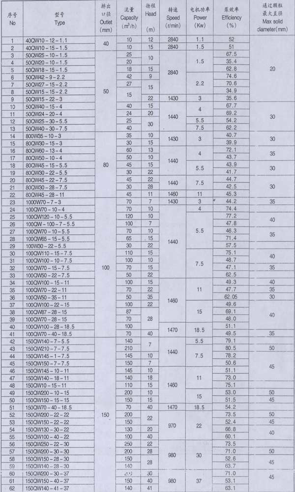 QW型系列混流式潛水泵系單級、單吸、軸向吸入、立式、機電一體、葉輪與電機軸直聯(lián),潛入泥漿、原油或清水等介質(zhì)中工作,輸送介質(zhì)的混合物比重為1:1-1:1.45。是油田石漬鉆井過程中抽送漿、清水或原油至循環(huán)泥漿池最理想的配套設(shè)備。也是電廠礦山、煉油、造紙、印染、環(huán)保、市政工程、化工、漁塘鹽廠、釀造、大理石廠、建筑、煤礦等行業(yè)抽排泥漿和污水理想的泵型。同時,也可根據(jù)用戶的實際使用要求及介質(zhì)情況,設(shè)計生產(chǎn)其它規(guī)格型號產(chǎn)品.